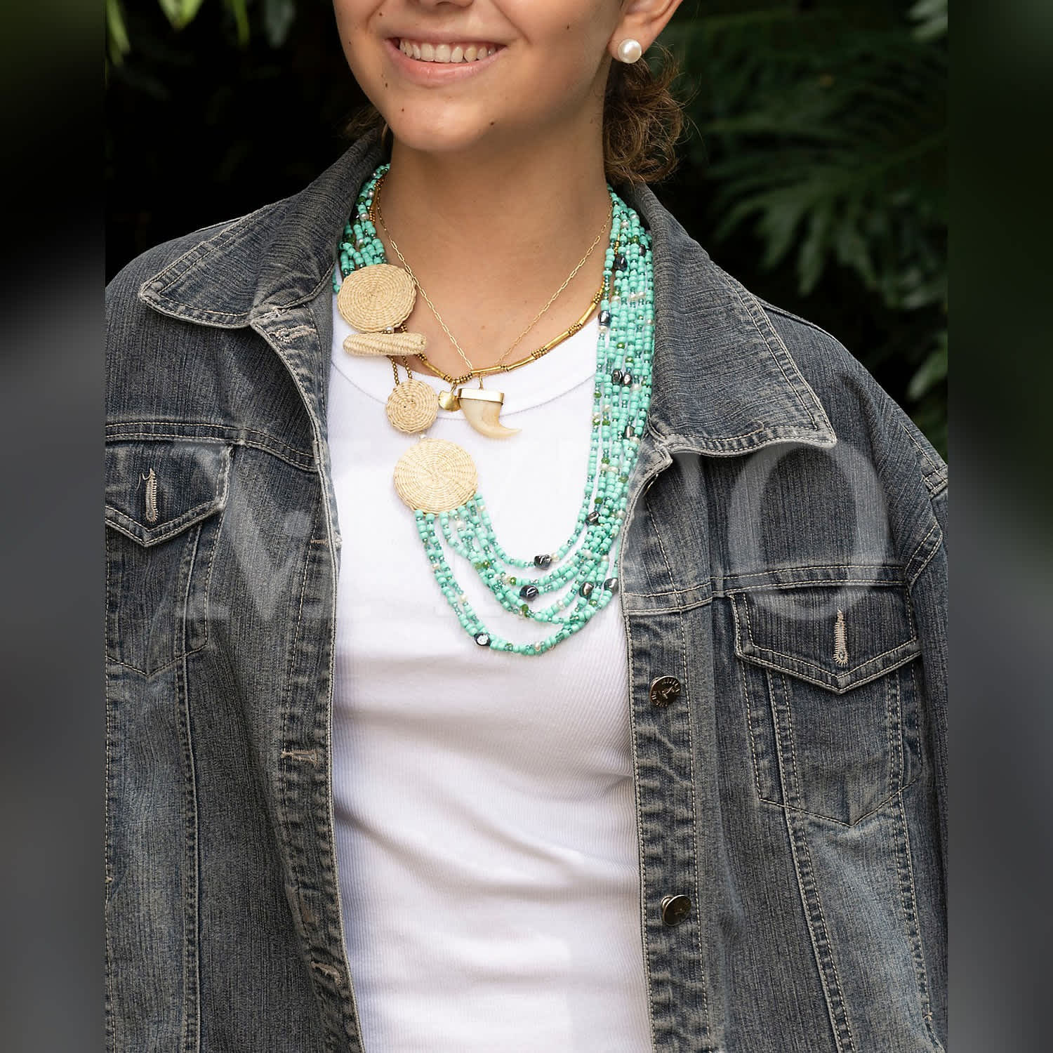 Mutliple bead and pearl neclace with a beautiful Iraca fiber clasp to add a touch of surprise. It is sure to complete any outfit.