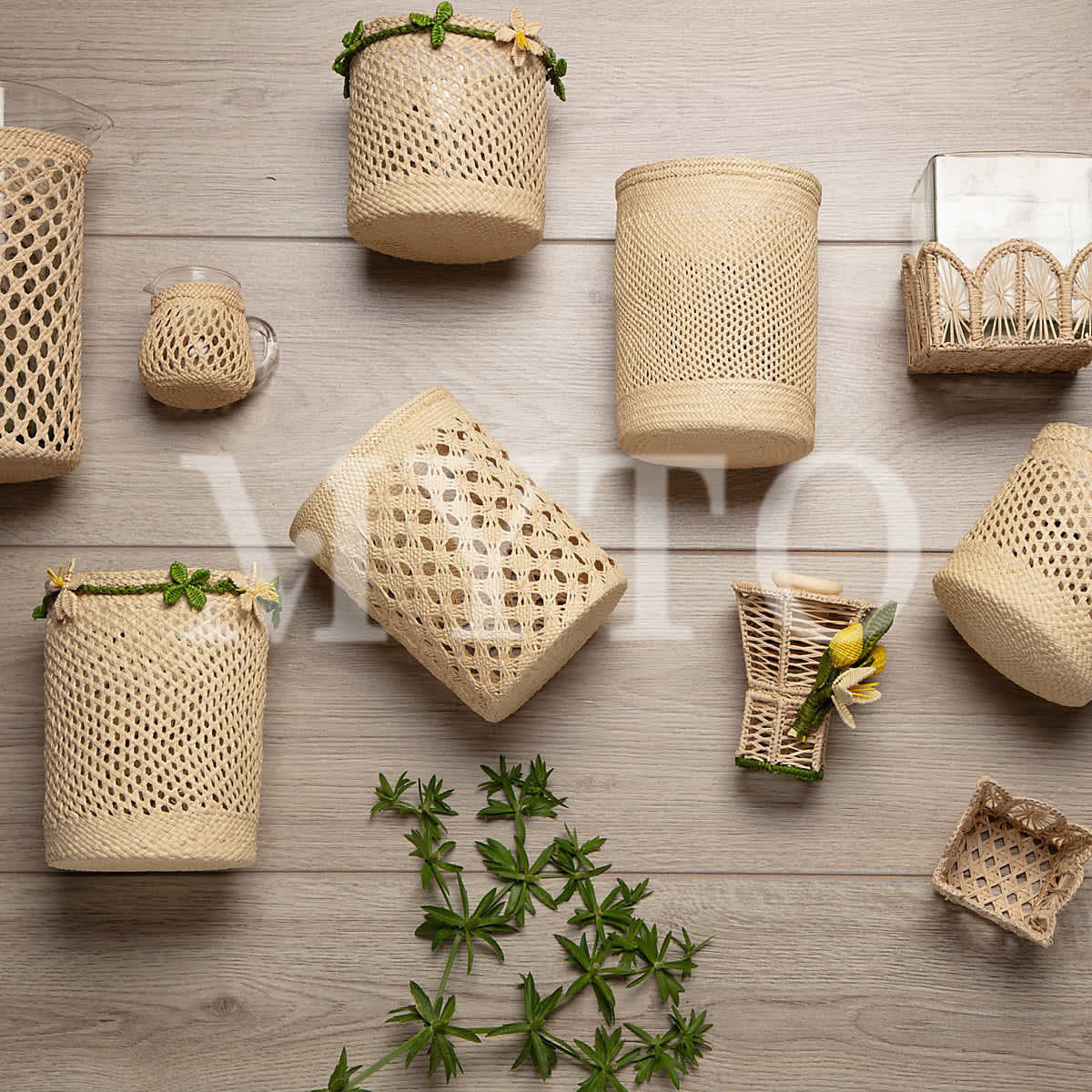 This container features a handcrafted design with a delicate woven pattern in natural fibers. It is accented with small, charming blossoms in shades of green and yellow around the rim, adding a touch of nature-inspired elegance.