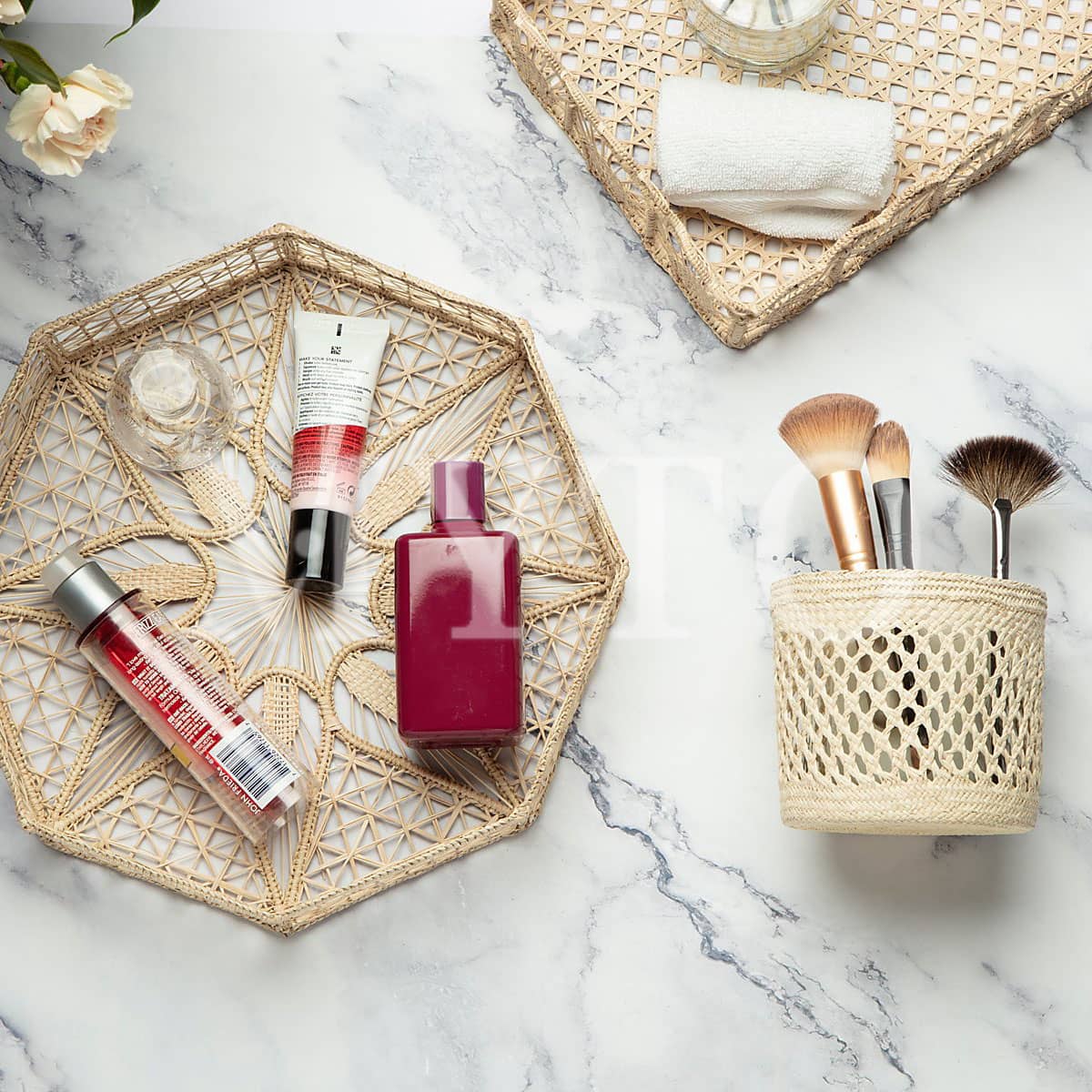 An octagonal tray with intricate woven patterns creating a central starburst design. The edges are delicately crafted, highlighting the meticulous handwork involved. Ideal for serving or as a decorative centerpiece.