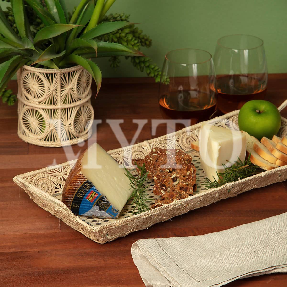 This tray features a rectangular design with intricate coiling patterns. It's perfect for serving cheese, crackers, and other appetizers in a stylish manner. It can also be used to carry a few pieces to any table. Its removable glass on the bottom makes it the perfect accent for a wine and cheese setting.