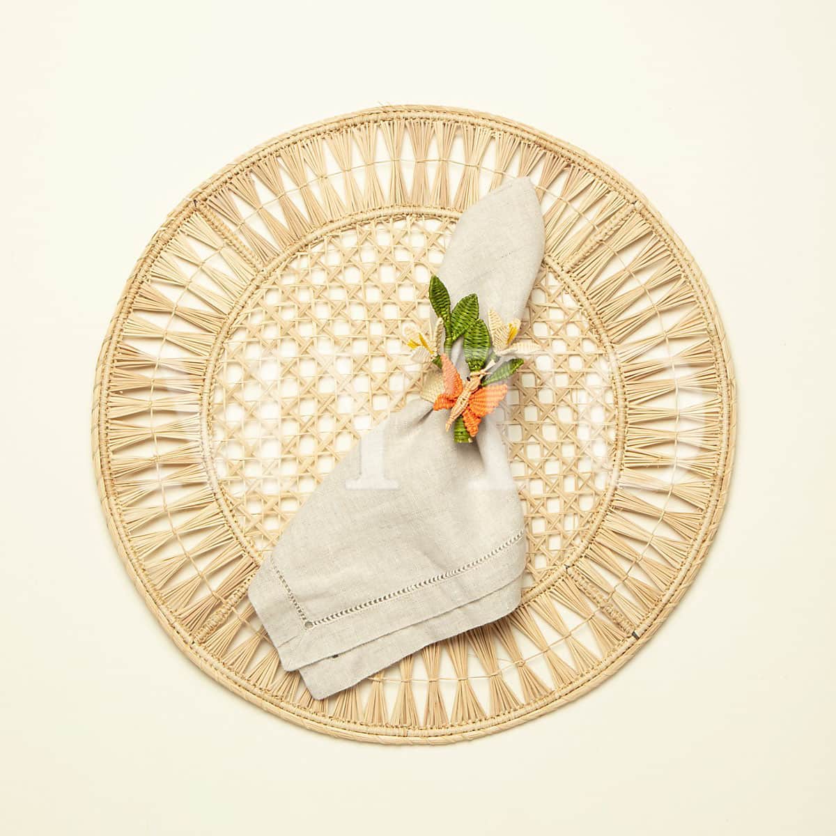 This elegant napkin ring showcases a pair of delicate flowers with a charming butterfly accent. The intricate weaving and natural fiber construction add a touch of whimsical beauty to any dining experience.