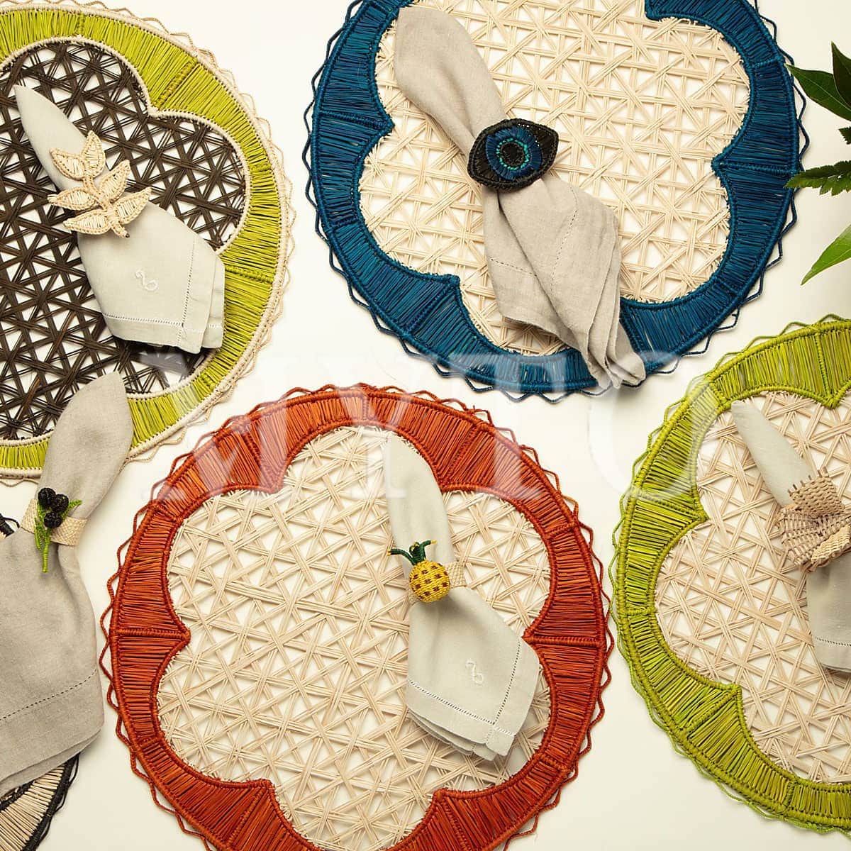 These placemats are beautifull, with a flower shape and an outer border that gives them a contemporary feel. The beauty of these pieces is how by changing the color way or by filling the outher border or innnet space, you have a completely new piece. All of them are carefully crafted in Iraca fiber covered wire structure.