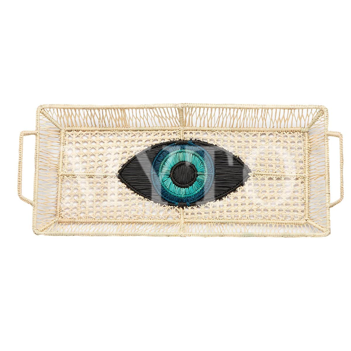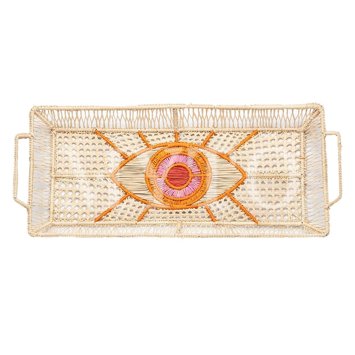 A fun tray adorned with vibrant eye motifs in different color variations (blue, orange, pink). The handwoven details add a touch of charm and uniqueness, making them ideal for both serving and decorative purposes. These trays a very practical due to the removable glass that they have on the bottom, making them easy to clean after serving your choice of apetizeres!