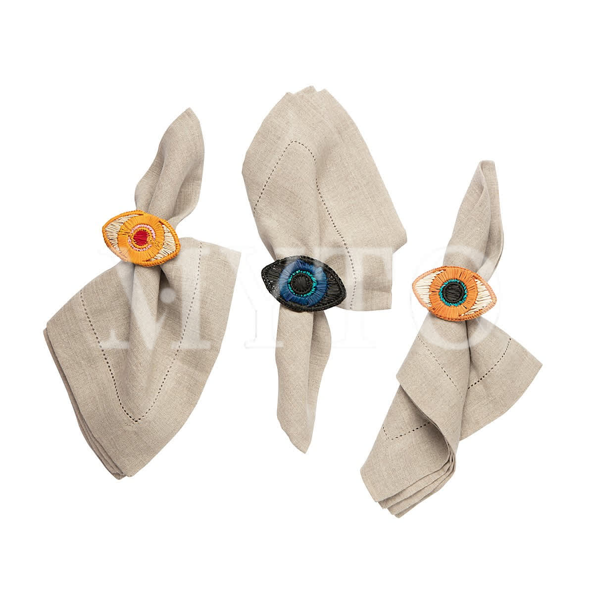 Fun and funky Good luck napkin rings are inspried in the Turkish eye for good luck and protection. These napkin rings in Iraca covered wire structure are a way to add a modern and playful touch to any table.
