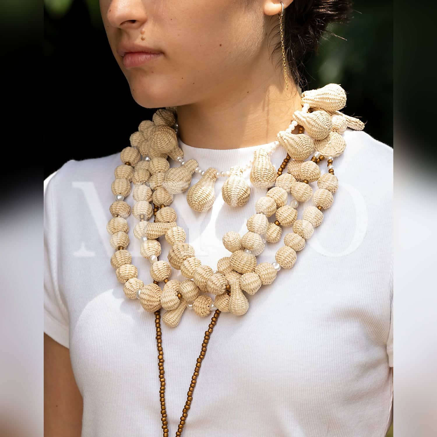 This necklace is made of three strands of iraca pieces in various shapes and sizes combined with fresh water pearls. This is a stunning necklace sure to turn a simple outfit into a show stopper. Its easy to wear since it´s so light weight. Certain to become a favorite.