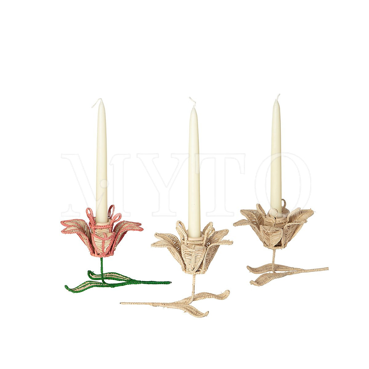A charming candle holder designed to resemble a blooming flower. Crafted in iraca fiber with wire structure, the pink and green fibers forms the petals and stem, creating a delicate and colorful decorative piece. This piece comes with a ceramic insert for the candle. The Lily Candel holder can be used in a set table to enhance the lighting and delight the setting or on table on its on as a decoration.