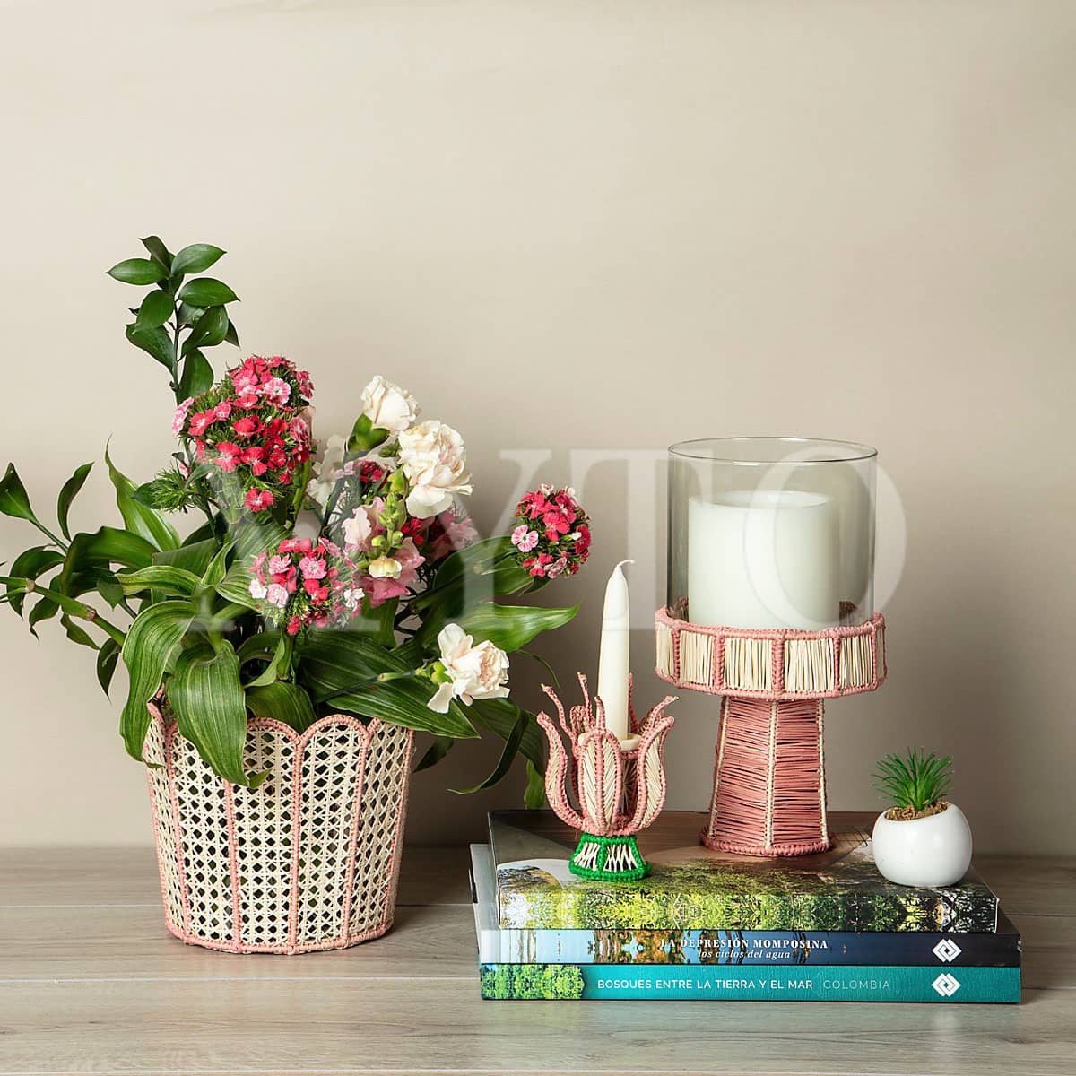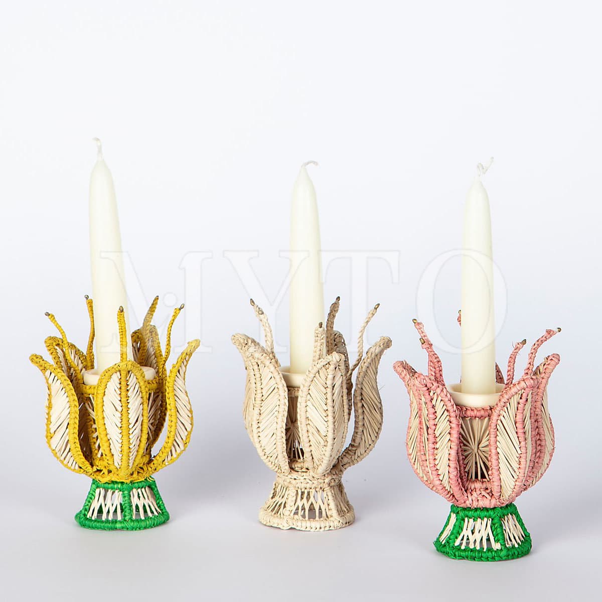 Similar in design to the pink version, this yellow tulip candle holder features a bright yellow flower and green base. The natural fiber construction and detailed weaving make it a delightful and eye-catching piece.