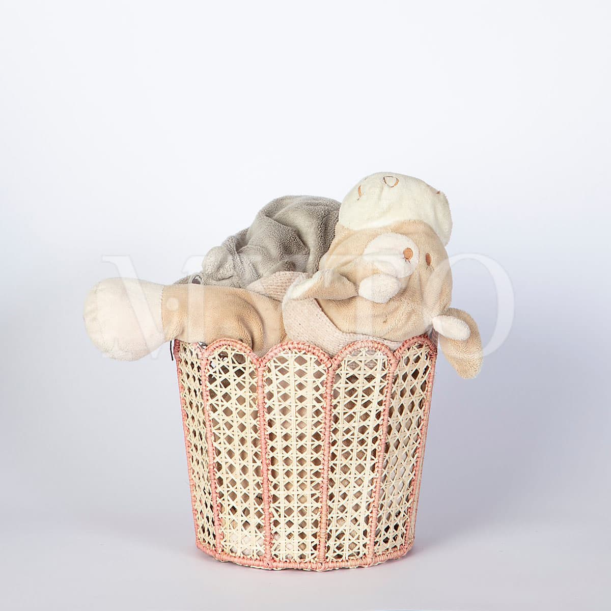 This pink scalloped bucket container combines the delicate color with intricate weaving. The natural fibers and scalloped edges create a charming and decorative piece suitable for various uses.