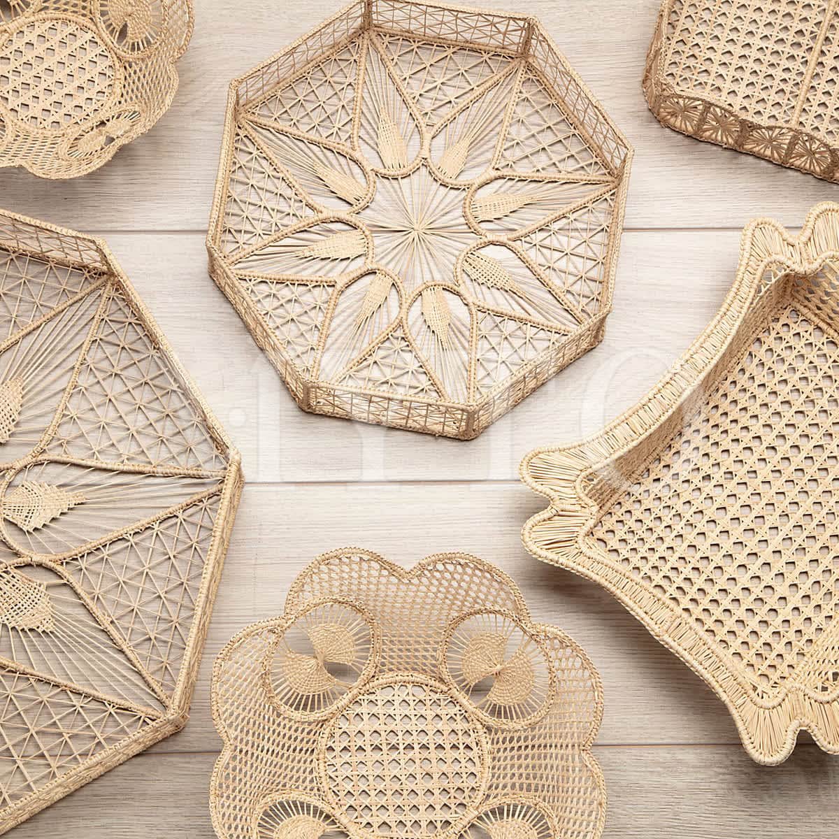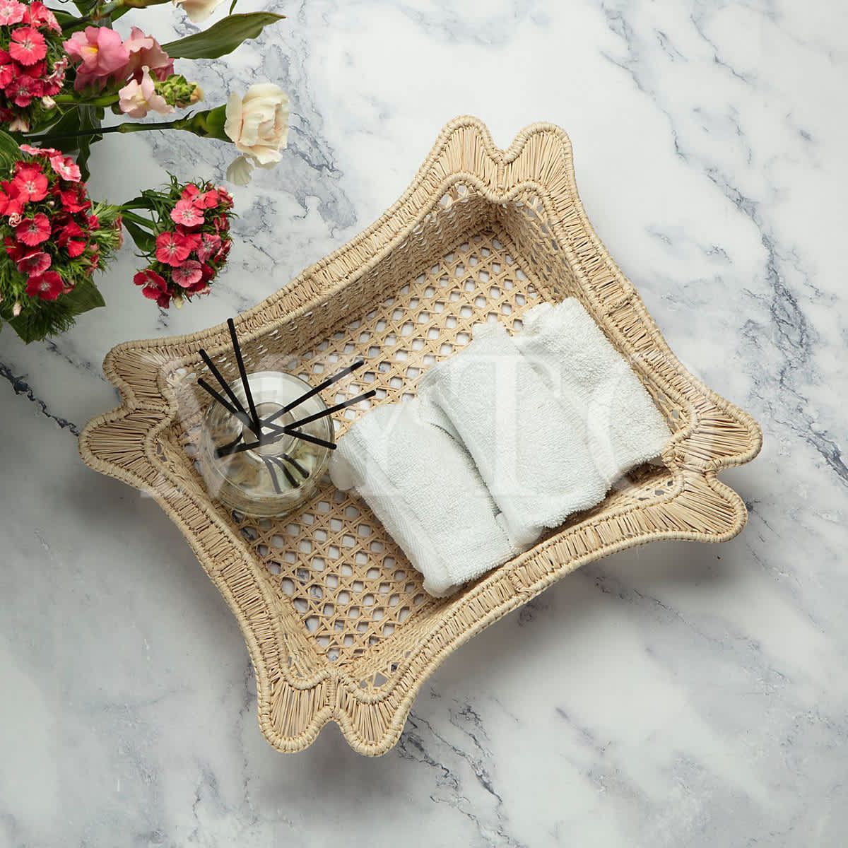 A uniquely shaped rectangular tray with a playful swirl design on the edges. The open weave pattern in the center adds to its charm, making it ideal for both functional and decorative use.