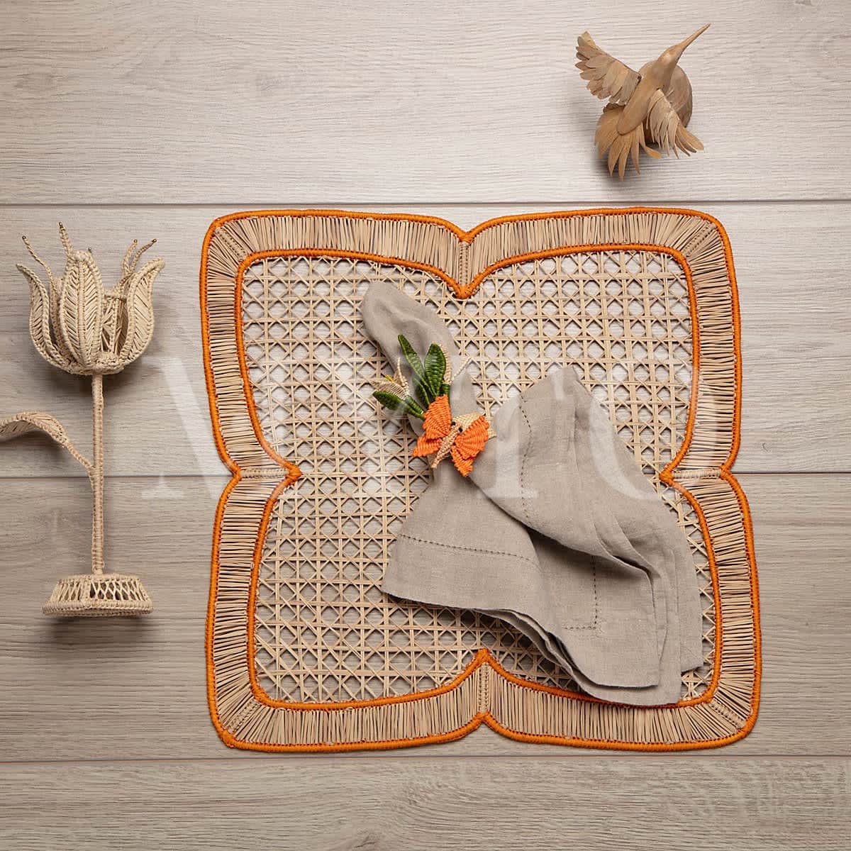 Featuring an intricate open-weave design, this square placemat is bordered with a vibrant orange trim. The flower-like shape and natural fibers make it an eye-catching and stylish addition to any table.