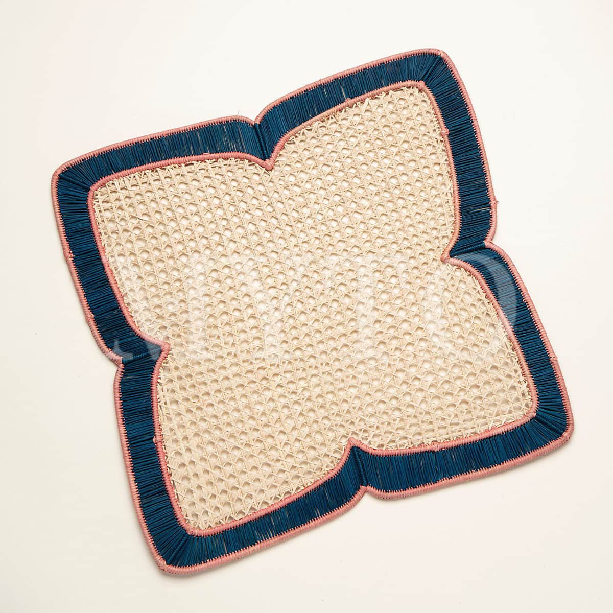 This pair of square placemats showcases a unique flower-inspired design with a delicate open-weave pattern. The blue and pink borders add a pop of color, making these placemats both functional and decorative for any dining table.
