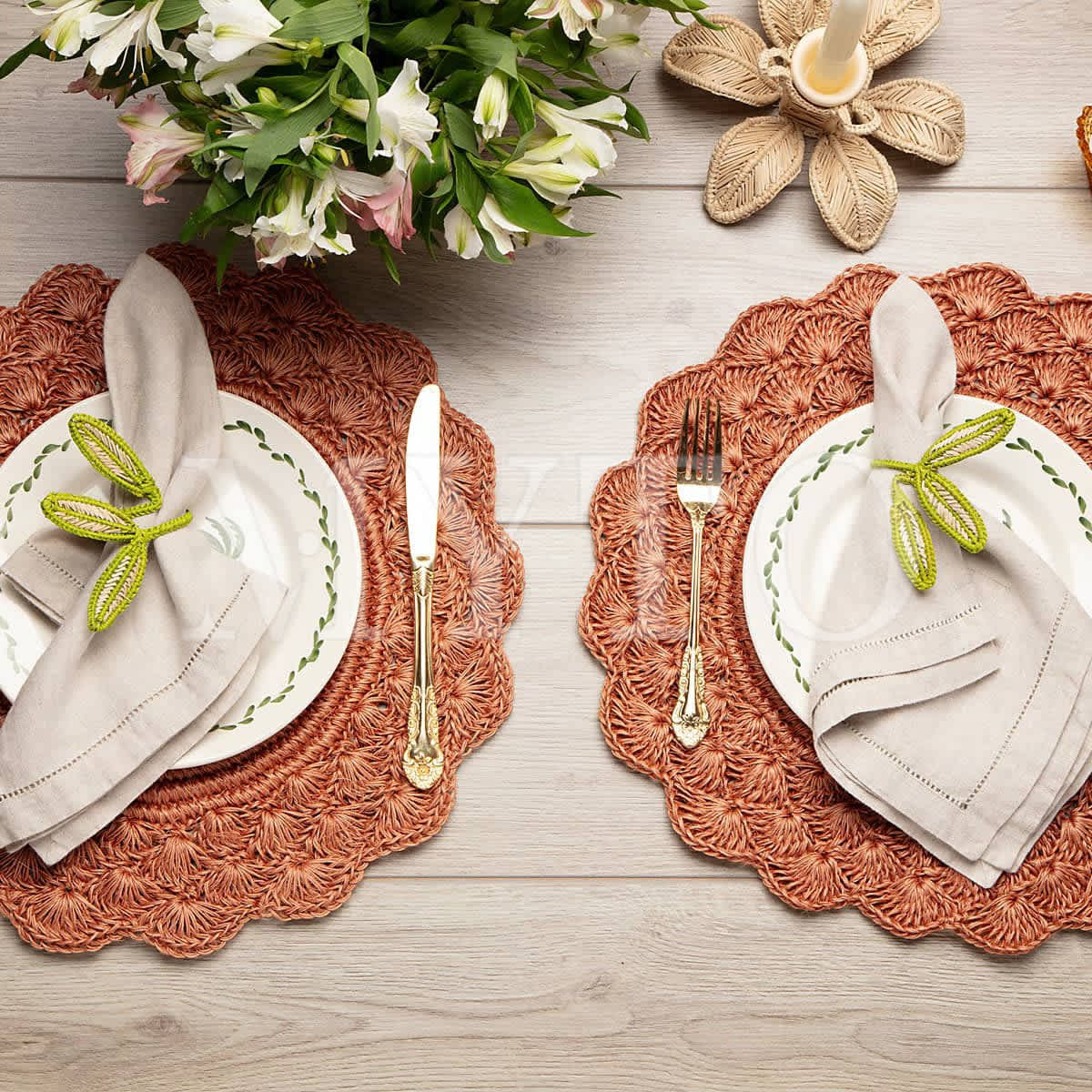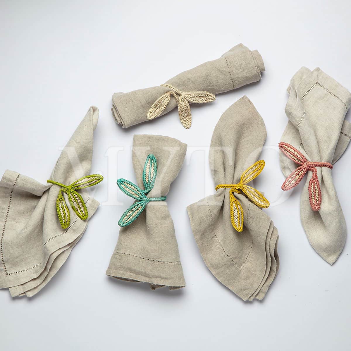 This napkin ring features three leaves woven in a fresh green color. The natural fiber construction and detailed design add a touch of nature-inspired elegance to any dining experience.